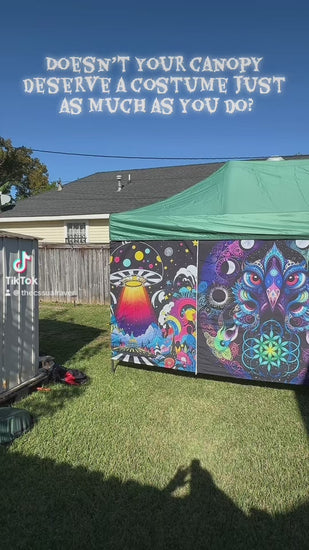 Turn your 10×20 canopy into an enclosed space, dressed up with our Mushroom Abduction and Midnight Owl RaveWalls (NO FULL SIZED GRAY PANELS). This unique and easy set up wall system turns your 10×20 canopy into an enclosed weather resistant structure that's breathable and allows you to control the airflow of your camp. Our wall system is completely modular and can be connected with other LazerTents to create custom shaped mega tents. The perfect solution for group camping, music festivals, ren fairs and short-term camping trips!